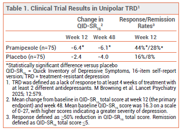 CONCLUSION — In a 48-week, double-blind trial in patients with unipolar treatment-resistant depression, adjunctive treatment with the dopamine agonist pramipexole (not an FDA-approved use) significantly reduced depressive symptoms compared to placebo, but discontinuation of the drug due to intolerance was common.