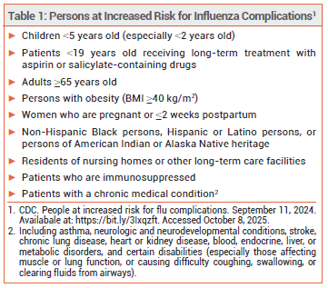 1. CDC. Influenza antiviral medications: summary for clinicians. December 8, 2023. Available at: https://bit.ly/48KeAna. Accessed October 8, 2025.